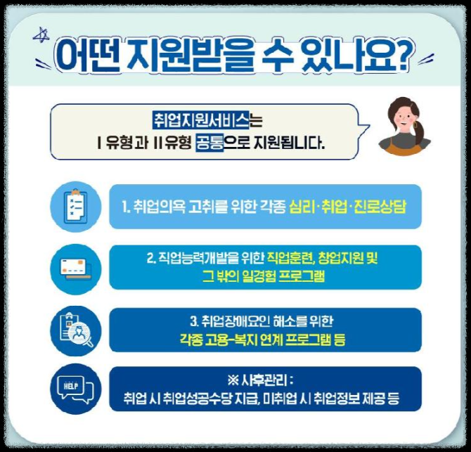 A2. 1 유형은 저소득층, 청년, 중장년 등이 대상이며 구직촉진수당이 포함됩니다. 2 유형은 일반 구직자 및 경력단절자 대상으로 취업지원서비스 중심 지원입니다.