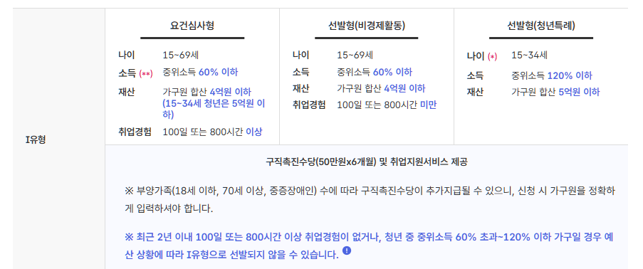 1 유형은 저소득층, 청년, 중장년층 등이 대상이며 구직촉진수당과 취업지원서비스를 받을 수 있습니다. 1 유형 신청자는 국민취업지원제도 소득재산 기준인 가구 중위소득 60% 이하, 재산 기준을 충족해야 합니다. 유형별 수당 지급 신청에 대한 안내도 확인해 보시기 바랍니다.