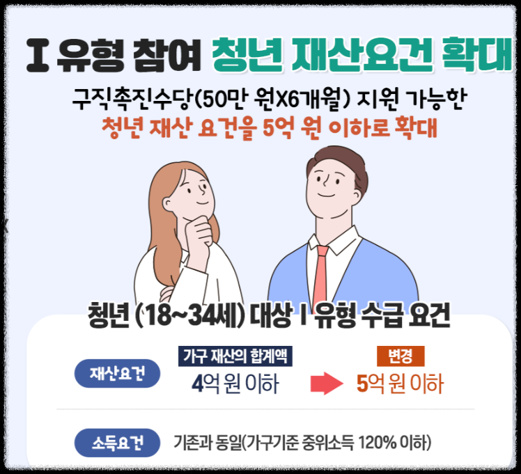 국민취업지원제도 신청 시 1 유형의 경우 소득과 재산 기준이 엄격히 적용됩니다. 가구단위 중위소득 60% 이하, 총 재산 4억 원 이하가 기본 조건이며 부동산, 자차, 금융자산까지 모두 포함됩니다. 1인 가구 기준 월 소득 약 125만 원 이하, 2인 가구는 약 208만 원 이하입니다.