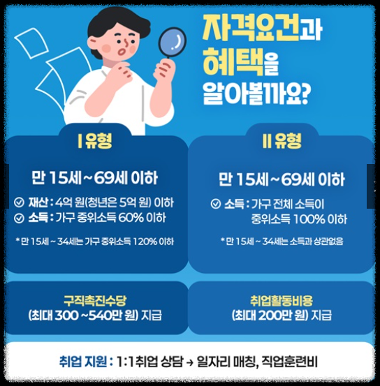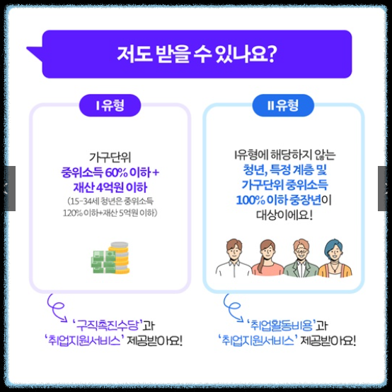 국민취업지원제도는 1 유형과 2 유형으로 나누어지며, 유형에 따라 지원 내용과 대상이 다릅니다.
